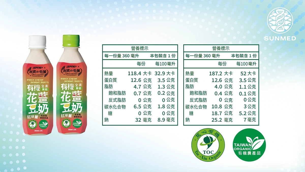 品 名:有機花薑豆奶 機能飲【無糖】【全素】